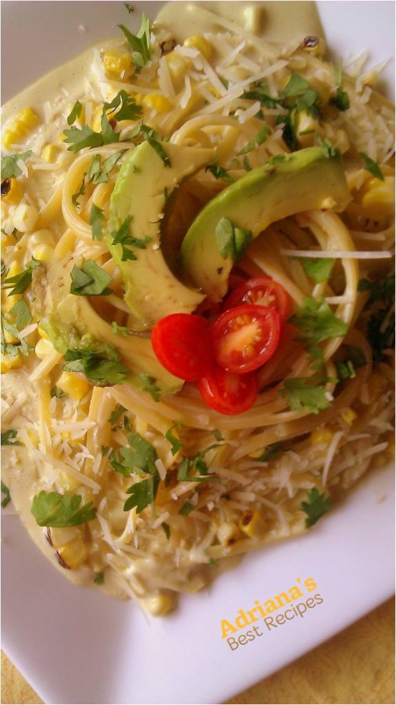 Cook your pasta in hot salty water until becomes “al dente”, take out the water and pour the avocado and corn sauce on top and combine well, serve in a nice dish, sprinkle Cotija cheese and garnish with cilantro and cherry tomatoes.