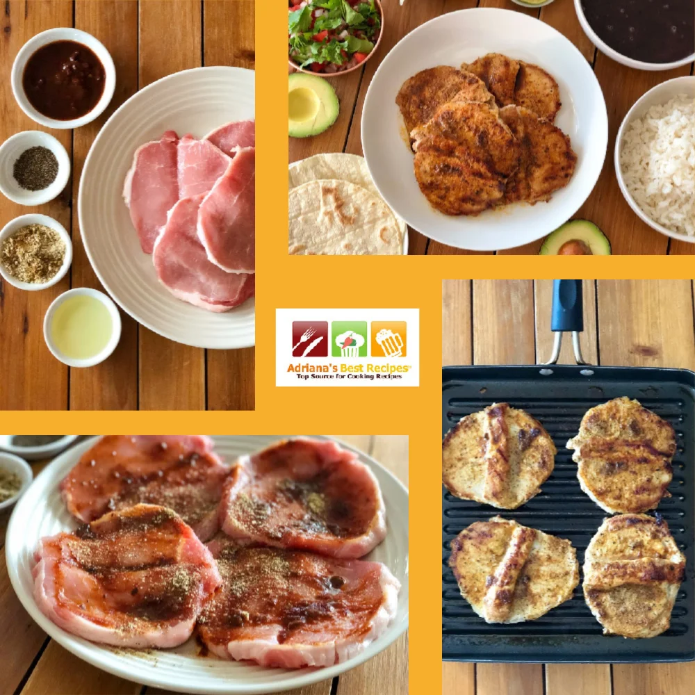 The grilled pork chops are lean and ready in a few minutes. We are pairing the boneless pork chops with Mexican favorites, such as white rice, black beans, fresh produce, avocado, and pico de gallo salsa.