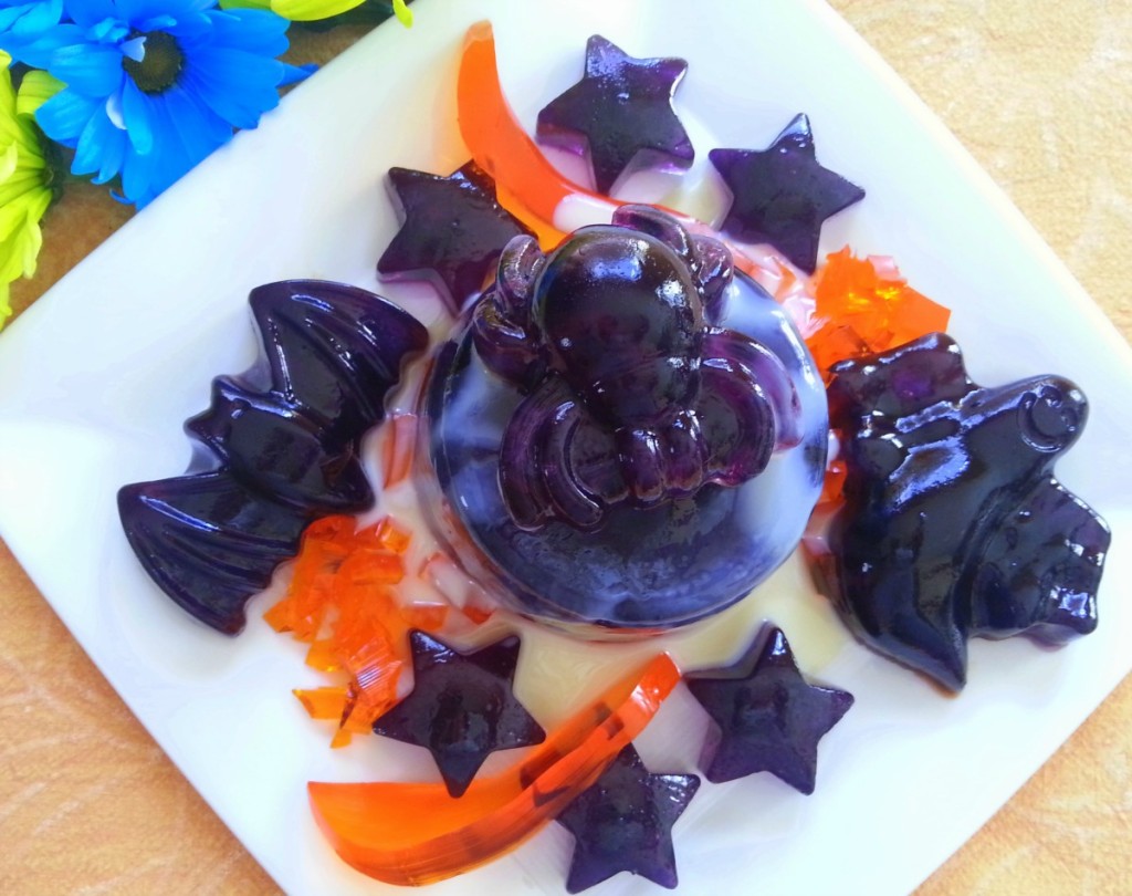 Preparation time: 30 minutes though jello needs about 2-3 hours to set, it is recommended to prepare a day in advance. You will need a small brush, measuring cup, a halloween mold, a tray, 2 bowls and 1 deep round 4 inch mold and a plate. This recipe serves 4 guests around $0.75 cents per person depending on the product cost at your local supermarket.